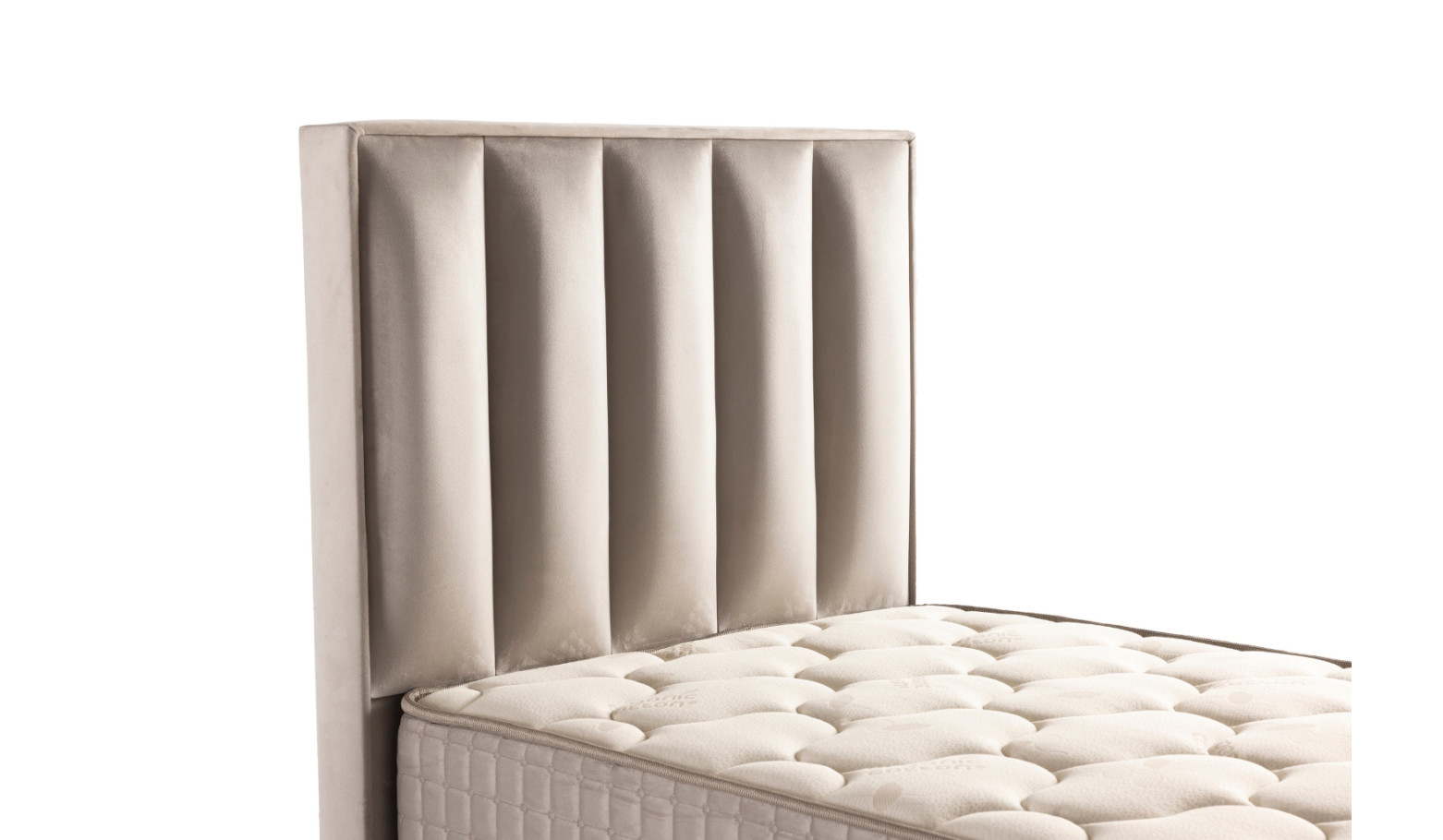 De boxspring heeft een strak hoofdbord met verticale banen en is bekleed met zachte meubelstof in de tijdloze kleur taupe. Dankzij het mechanische veersysteem is het matras met 7-slags pocketvering en koudschuim eenvoudig op te tillen. Hierdoor ontstaat ruime opbergruimte onder het volledige slaapgedeelte.