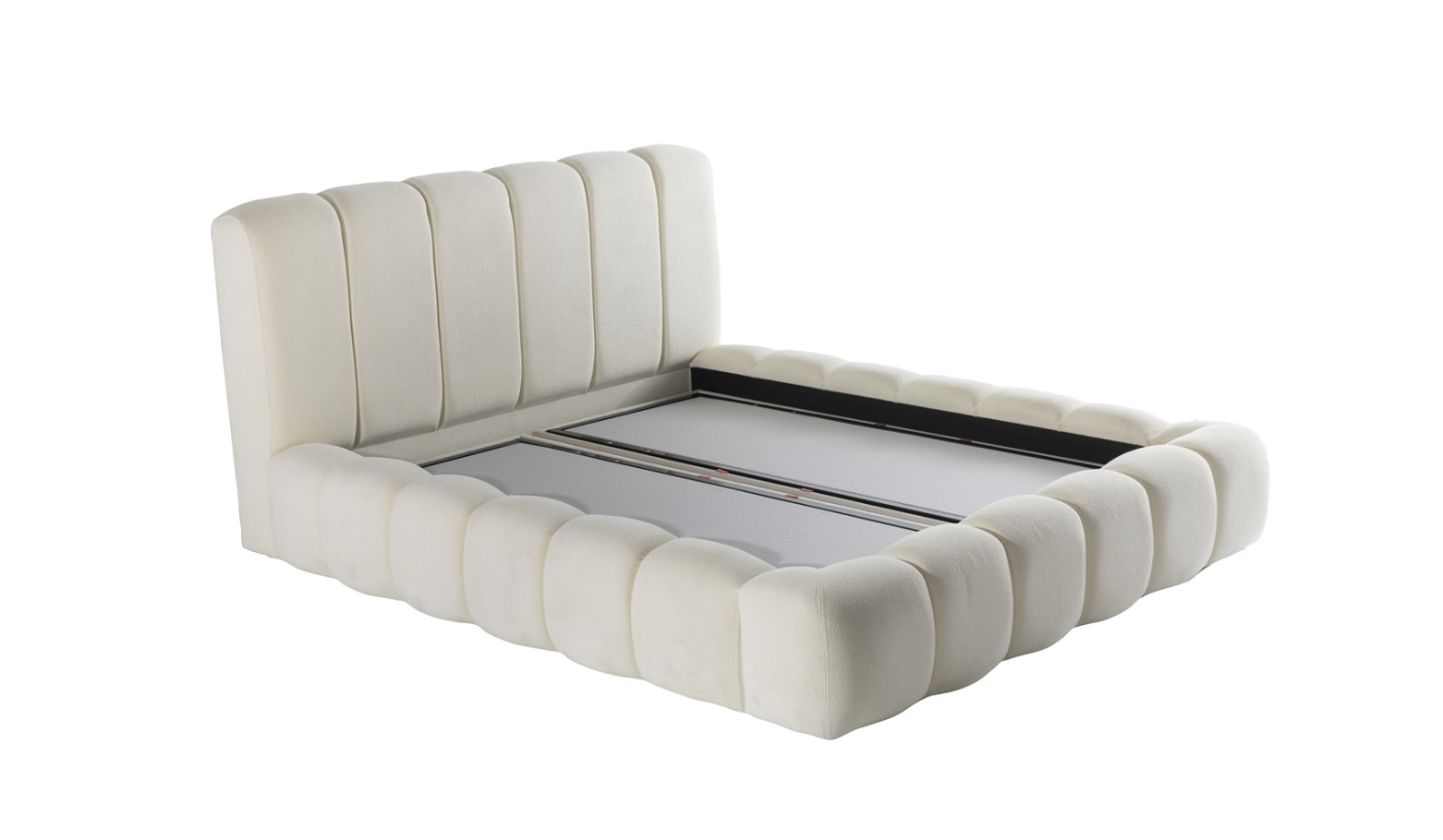 Het hoogtepunt van het bed is echter niet alleen zijn esthetische ontwerp, maar ook zijn functionaliteit: onder het comfortabele ligoppervlak bevindt zich een ruime opbergruimte, die toegankelijk is via een slim, gemakkelijk te bedienen klapmechanisme. Ideaal om beddengoed, dekens of andere benodigdheden onzichtbaar op te bergen, zonder in te leveren op stijl.
